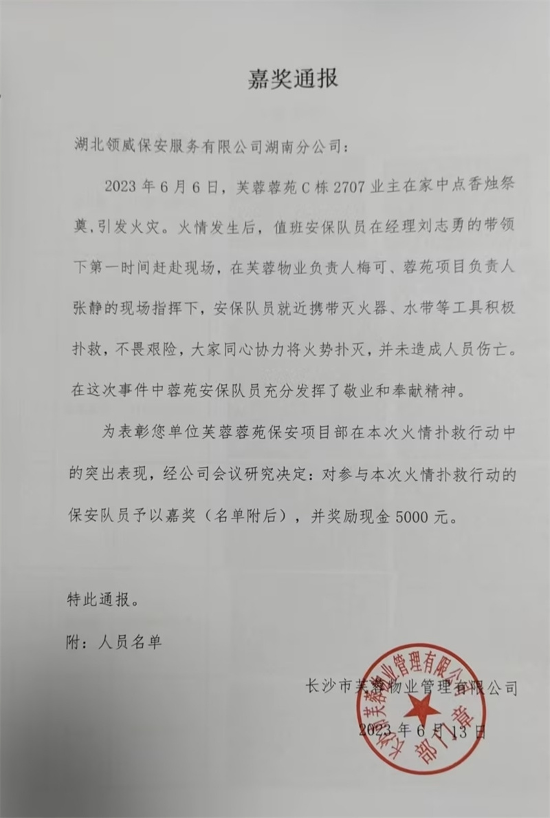客戶單位長沙市芙蓉物業(yè)公司對此次事件中參與救火的安保隊員們的敬業(yè)奉獻精神給予了高度的評價及贊賞,并發(fā)布表揚通告獎勵現金5000元,以此來肯定隊員們的突出表現。