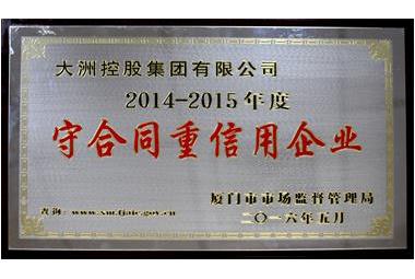 2016年7月27日上午,廈門市2014-2015年度守合同重信用企業(yè)經(jīng)驗(yàn)交流暨表彰大會(huì)于國(guó)際會(huì)議中心隆重舉行。大洲控股集團(tuán)有限公司榮獲“2014-2015年度廈門市守合同重信用企業(yè)”榮譽(yù)稱號(hào)。